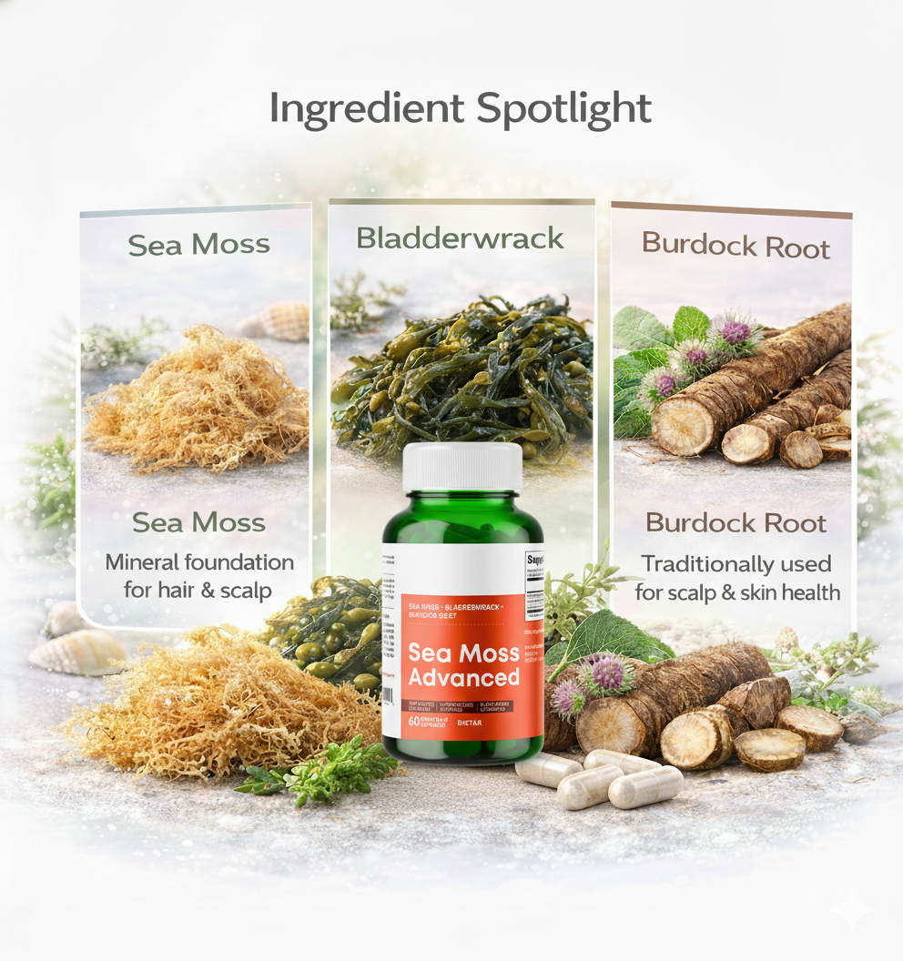 Sea Moss Advanced delivers over 90 trace minerals to help nourish hair at the root, with added support for thyroid function, energy, and overall wellness.