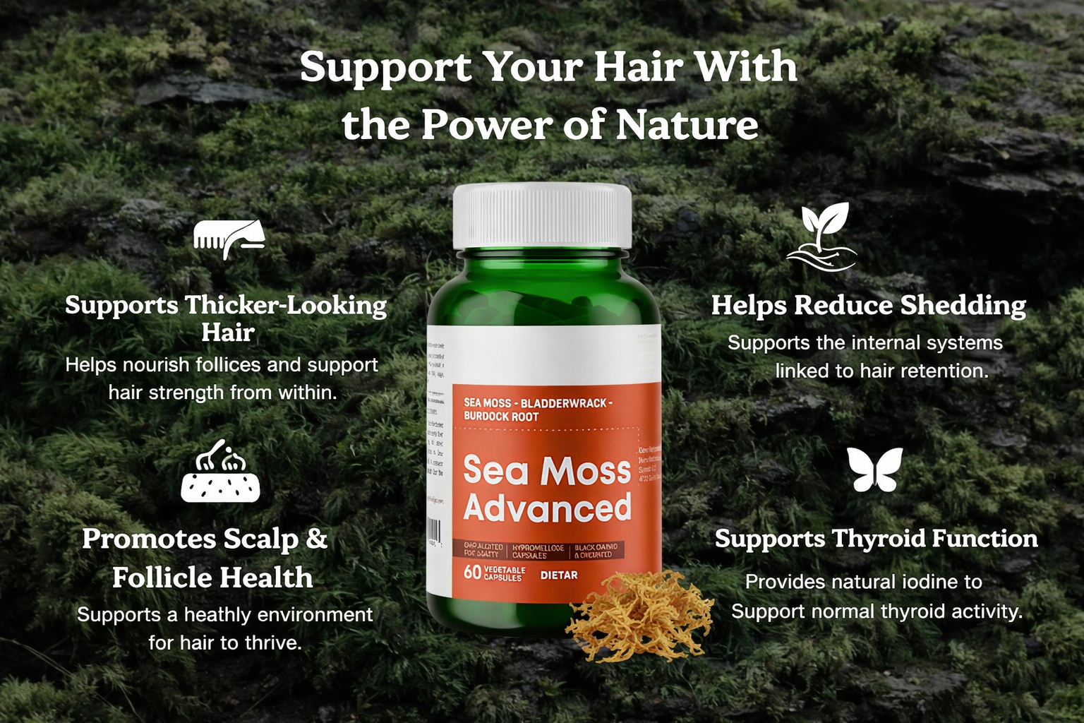 Sea Moss Advanced is a dietary supplement that supports the body’s nutritional systems related to hair health. It does not diagnose, treat, or cure hair loss.